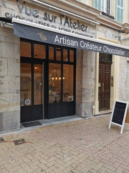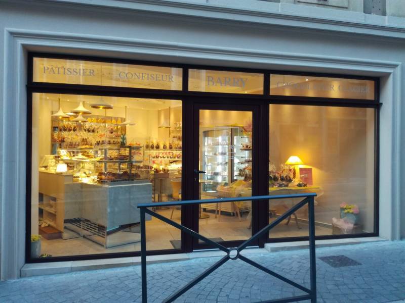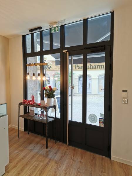 La société 2B Alu a réalisé la rénovation complète d'une devanture de magasin de couleur gris anthracite pour chocolaterie à Hyères.Ensemble de vitrines composées d'une porte tertiaire en aluminium sur mesure avec bâton de maréchal intérieur et extérieur en inox, pose d'un châssis fixe latéral ave...